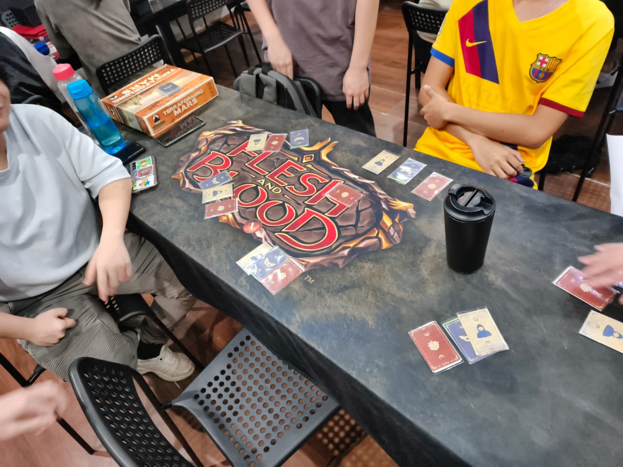 The game will involve players to move seats often, hence it is recommended to have all players stand while playing. It is also recommended to play on a more circular table.